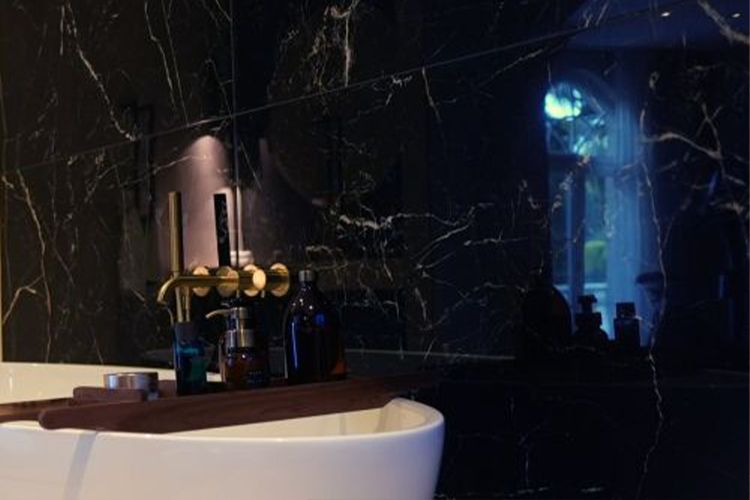In de badkamer van Kosso is er één opvallend kenmerk dat meteen de aandacht trekt: de prachtige zwart-witte marmerlook wandtegels van Navarti. Deze tegels voegen een tijdloze elegantie en verfijning toe aan de ruimte.