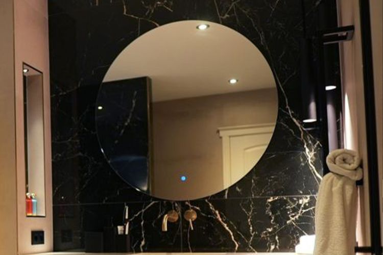 In Kosso's badkamer schitteren de spiegels als ware sterren. Deze ronde spiegels van Gliss Design uit de Oko-serie voegen niet alleen een hippe ronde vorm toe aan de ruimte, maar ook een dosis extra verlichting. De "backlight" verlichting langs de rand van de spiegel en op de muur zorgt voor een stijlvolle en praktische toevoeging.
