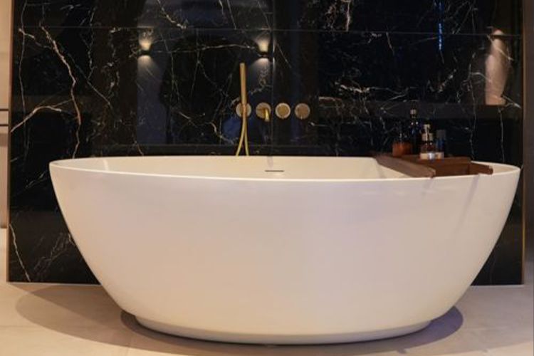 Het ovale vrijstaande ligbad in Kosso's badkamer straalt zowel eenvoud als luxe uit. Met zijn symmetrische ontwerp en het handige click-waste systeem is dit bad niet alleen visueel aantrekkelijk, maar ook praktisch.