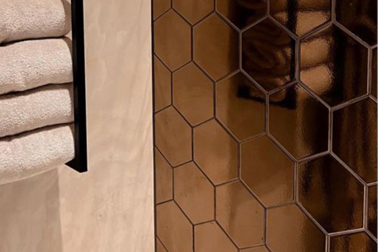 In het douche gedeelte van Sarah van Soelen's badkamer schitteren de opvallende hexagon tegels in de kleur Dark Gold. Ze voegen niet alleen stijl toe, maar ook functionaliteit aan de ruimte.