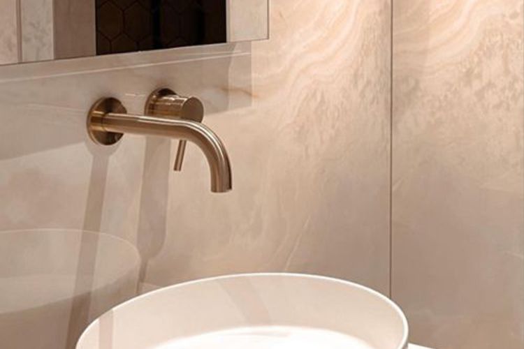 Deze badkamer straalt klasse uit, en de Wiesbaden messing gouden kranen voegen een vleugje glamour toe.
