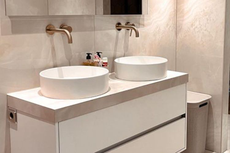 De waskommen in Sarah van Soelen's badkamer zijn niet alleen visueel aantrekkelijk, maar ook functioneel. Deze Salenzi Ceramic+ opbouw wastafels brengen een chique en sfeervolle sfeer naar de ruimte.