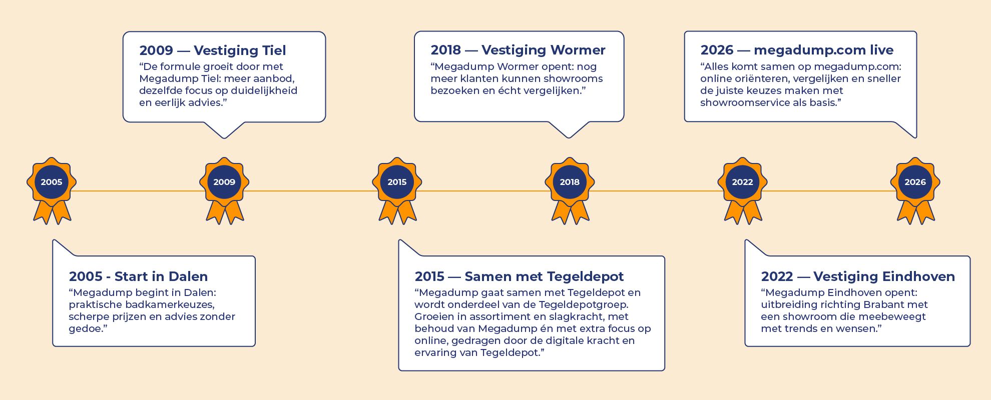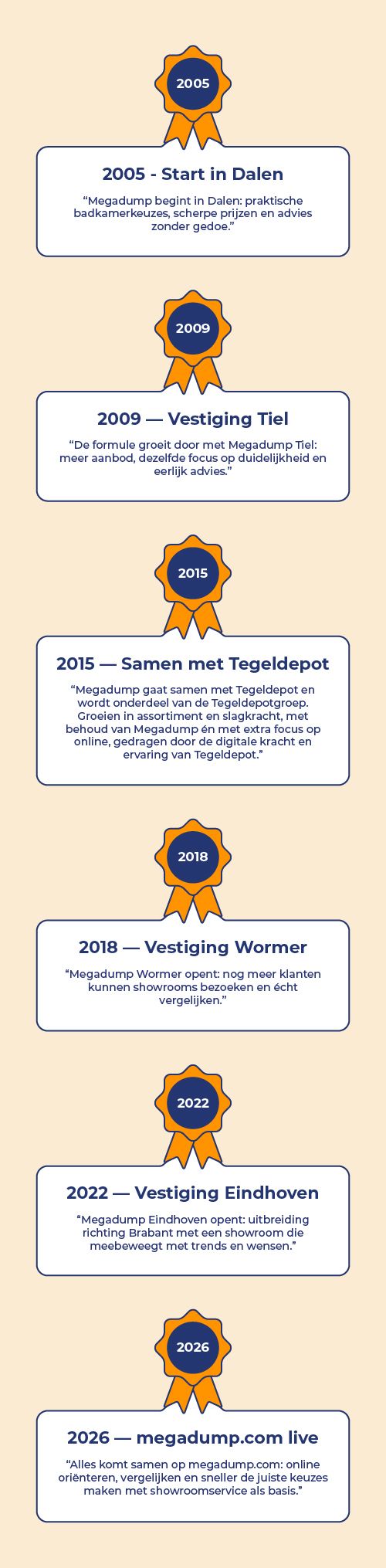 Vandaag de dag bouwen we door aan Megadump met één duidelijke focus: het je nóg makkelijker maken om de juiste badkamerkeuzes te maken. Dat doen we op drie manieren. We vernieuwen onze showrooms continu zodat opstellingen, stijlen en materialen actueel blijven. We houden ons assortiment strak up-to-date met wat nu gevraagd wordt van badkamermeubels tot kranen, douches en tegels. En met de komst van onze nieuwe webshop megadump.com brengen we alles samen op één plek: sneller zoeken, beter vergelijken en met dezelfde no-nonsense service als in de showroom.